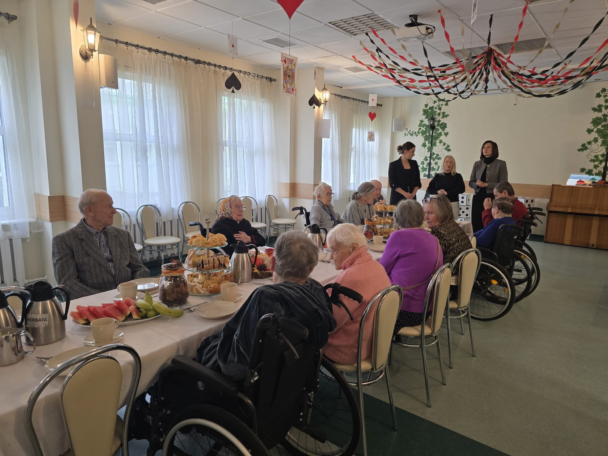 Czas nadrobić zaległości w aktualnościach. Jesteśmy w wirze świątecznych przygotowań, malujemy, kleimy, dziergamy, tworzymy piękne ozdoby, które powoli zdobią cały DPS, ale musimy Państwu wspomnieć o listopadowych urodzinach naszych Mieszkańców, które odbyły się w minionym tygodniu. Zastępca Dyrektora DPS Pani Monika Pilarska złożyła serdeczne życzenia wszystkim Mieszkańcom i razem z Kierownikiem Działu Terapeutycznego Panią Izabelą Kępińską oraz Kierownikiem Działu Opiekuńczego Panią Elżbieta Czwartos wręczyły solenizantom słodkie upominki oraz kartki z życzeniami. Na stole zagościł oczywiście przepyszny tort truskawkowo-śmietankowy oraz mnóstwo słodkich smakołyków. Śmiejąc się i wspominając dawne lata spędziliśmy wspólnie ten wyjątkowy dzień.