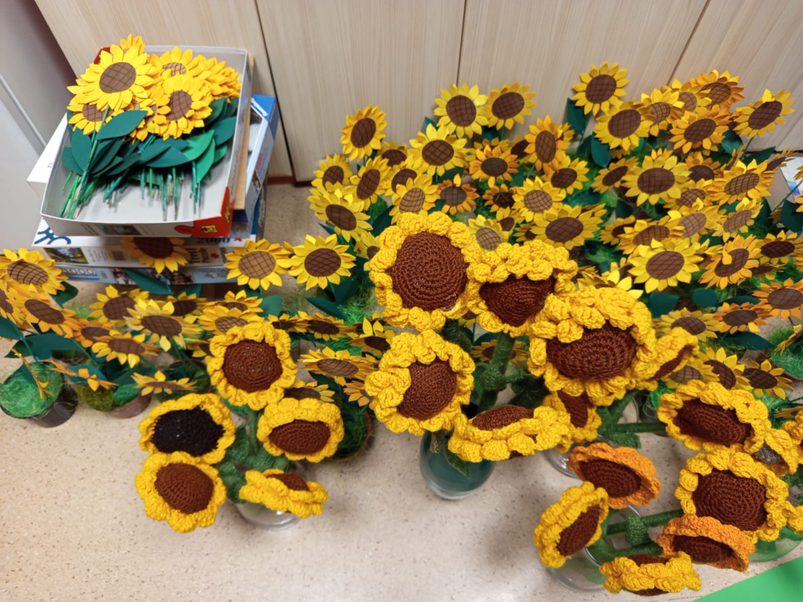 Tak więc pojawiły się słoneczniki „wszelkiej maści”: papierowe, wyklejane z bibułkowych kulek i dziergane z włóczki. I Mieszkańcy i Pracownicy potraktowali bardzo serio hasło „Wszystkie ręce na pokład”! Dzięki temu jest szansa, że uda nam się wszystko (nie tylko dekoracje) dopiąć organizacyjnie na ostatni guzik. W Zespole siła!