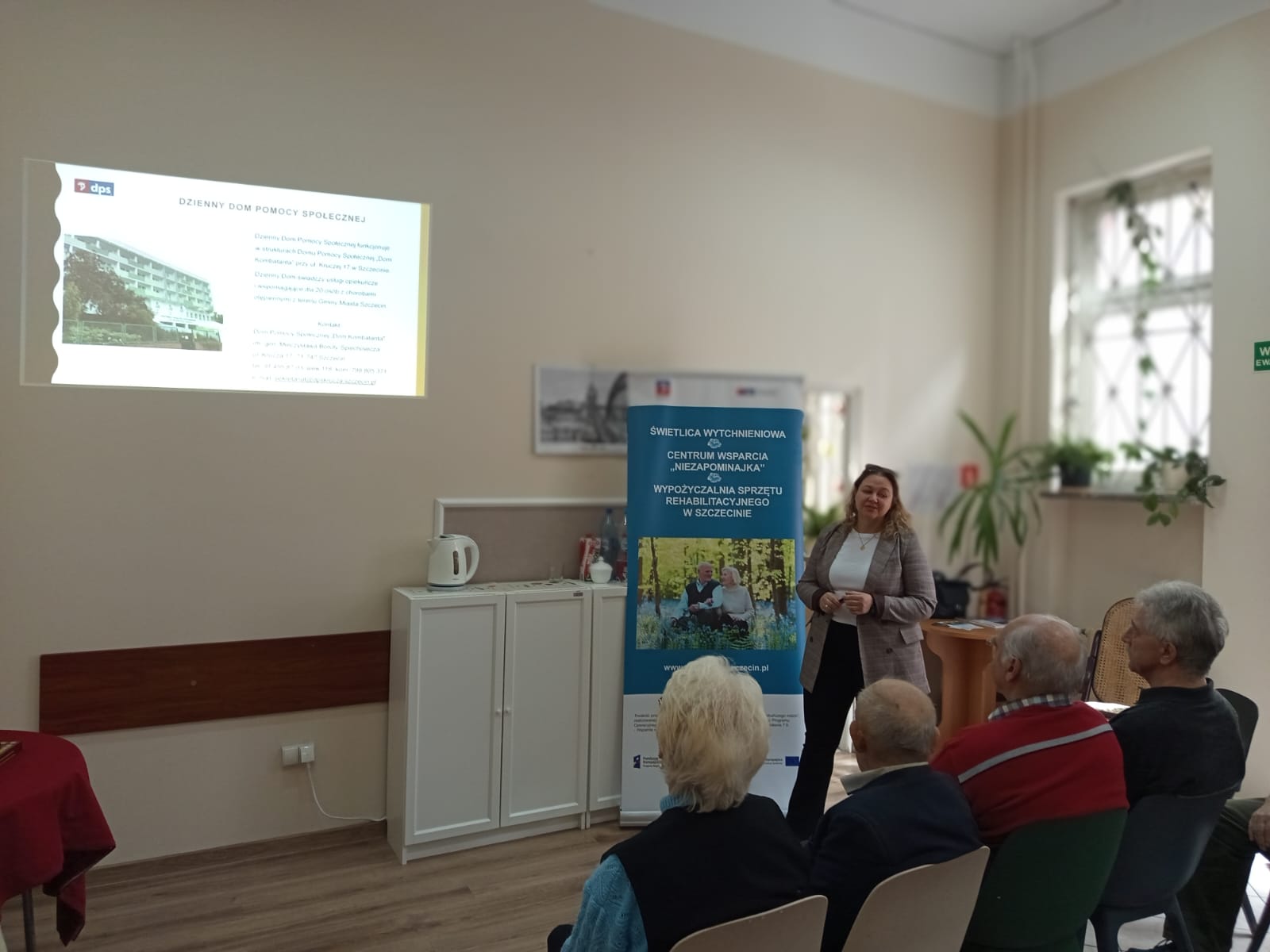 W środę 15 października w Klubie Seniora przy ul. Sławomira 9A w Szczecinie odbyło się spotkanie, podczas którego pracownice naszego Domu -Konsultantka Centrum Wsparcia „Niezapominajka” Iwona i Terapeutka Małgorzata- przybliżyły Uczestnikom problematykę dot. chorób otępiennych, w tym otępienia w przebiegu Choroby Alzheimera. Pierwsza część spotkania poświęcona była charakterystyce chorób otępiennych i profilaktyce– zdrowemu stylowi życia. W drugiej części przedstawione zostały działania podejmowane przez DPS „Dom Kombatanta” przy ul. Kruczej w Szczecinie, adresowane do Szczecinian chorujących otępiennie i ich opiekunów, a także do osób chcących skorzystać z Wypożyczalni Sprzętu Wspomagającego i Pielęgnacyjnego. Uczestnicy z zainteresowaniem wysłuchali obu prelekcji, byli aktywni – dzielili się swoimi refleksjami i doświadczeniami życiowymi. Dziękujemy za zaproszenie i miłą atmosferę spotkania!
