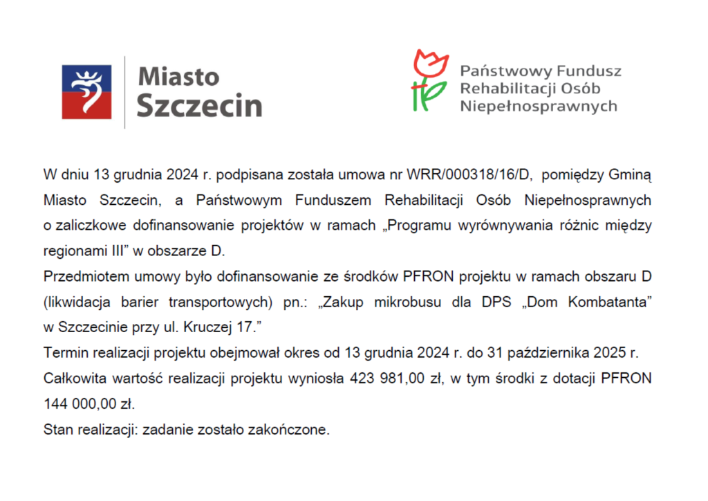 W dniu 13.12.2024 r. podpisana została umowa pomiędzy Gminą Miasto Szczecin, a Państwowym Funduszem Rehabilitacji Osób Niepełnosprawnych o zaliczkowe dofinansowanie projektów w ramach w ramach projektu „Program wyrównywania różnic między regionami III” w obszarze D.